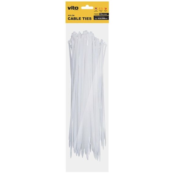 FASCETTE PER CAVI VITO PLASTICK realizzate in NYLON6 (PA6) di colore BIANCO con protezione UV e test di tensione di 22 kg. Le dimensioni di una fascetta sono 4.6X300 mm. Facile installazione manuale.