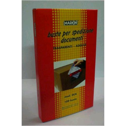BUSTE ADESIVE PER SPEDIZIONE DOCUMENTI MARKIN DLN. 100 BUSTE ADESIVE PER SPEDIZIONE DOCUMENTI 225x122 mm. Trasperenti - Adesive - Senza dicitura. Misure esterne: 235x132 mm.