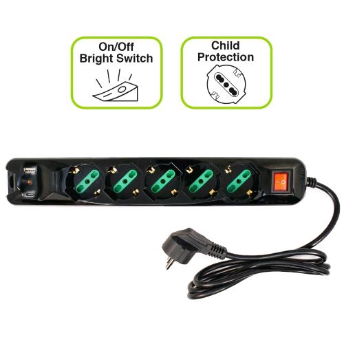 Multipresa Tecnoware con 5 prese Schuko/Italia 10/16A 1xUsb-A e 1xUsb-C con Power Delivery e QC3.0 spina a muro Schuko con interruttore On/Off colore Nero