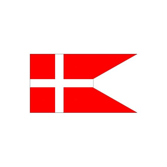 Bandiera di stato (riservata alle occasioni ufficiali), della marina da guerra e di bompresso, risalente al XIII-XIV secolo. Proporzioni attuali 56/107 (circa 1/2); la profondità dell'intaglio è pari a 5/12 della lunghezza del drappo. Questa forma è probabilmente antecedente a quella rettangolare. Secondo una curiosa ipotesi peraltro poco fondata su prove, il nome Dannebrog avrebbe avuto anticamente un significato spregiativo; responsabili gli svedesi, che lo avrebbero interpretato con derisione come "brache dei danesi": la versione a coda di rondine infatti assomiglia vagamente a un paio di brache stese ad asciugare. Il rosso del campo è più vivace rispetto alla versione nazionale.