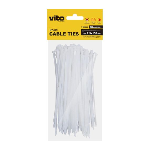 Le fascette per cavi VITO PLASTICK realizzate in NYLON 6 (PA6) sono di colore BIANCO con protezione UV e test di tensione di 8 kg. Ci sono 100 pezzi nella confezione. La dimensione di una fascetta è 2,5X150 mm.