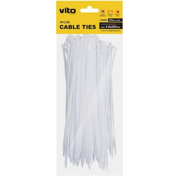 FASCETTE PER CAVI VITO PLASTICK realizzate in NYLON6 (PA6) di colore BIANCO con protezione UV e test di tensione di 18 kg. Le dimensioni di una fascetta sono 3.6X200 mm. Facile installazione manuale.