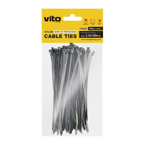 Le fascette per cavi VITO PLASTICK realizzate in NYLON 6 (PA6) sono di colore NERO con protezione UV e test di tensione di 8 kg. Ci sono 100 pezzi nella confezione. La dimensione di una fascetta è 2,5X100 mm.